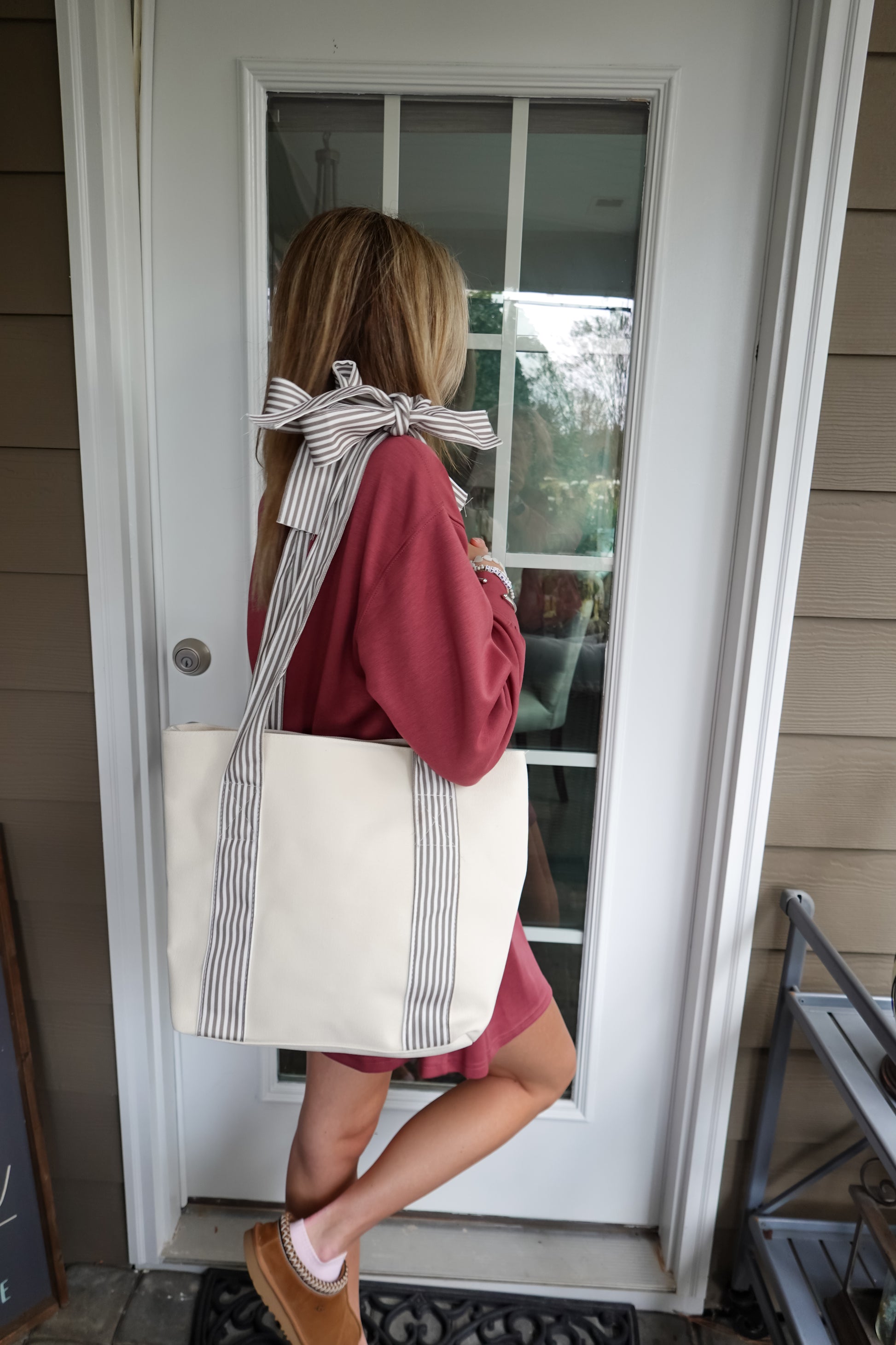 This Ribbon Bow Bag is designed with adjustable striped bow handles that add a touch of elegance to your everyday look. The handles can also be adjusted to your desired length, providing versatility and comfort. Complete with an inside pocket for easy organization. Perfect for any occasion.